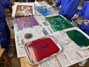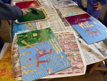 2025.10.23 5年生 5年生 図画工作科「重ねて広がる形と色」 図画工作科では、木版画に取り組んでいます。 彫る形や順番、刷り重ねる色など工夫しながら彫りと刷りを繰り返すことで満足のいく作品が完成しました。