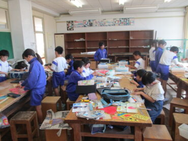 図画工作科では、のこぎりで切ってできた様々な形を組み合わせて、壁掛けを製作しています。