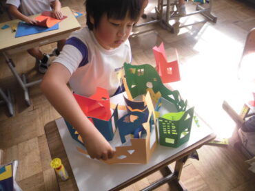 初めてカッターを使う子供もいてすごく緊張していましたが、好きな形に切れることが嬉しく、色々な形の窓や建物に挑戦していました。