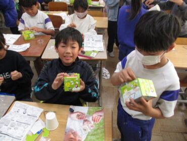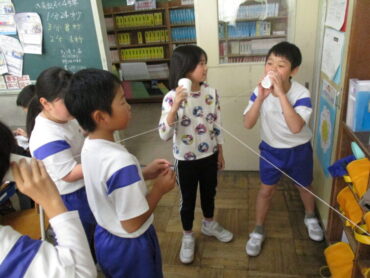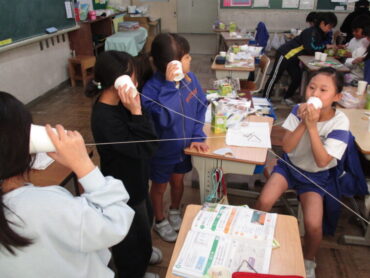 2025.11.27 3年生 3年生 理科 「音のせいしつ」 理科の時間に音が物の振動によって伝わることを学習しました。 学習したことをもとに、輪ゴムギターや糸電話を作り、音の伝わり方についてさらに詳しく調べました。 楽しみながら学習を進め、新たな気付きがあったようです。