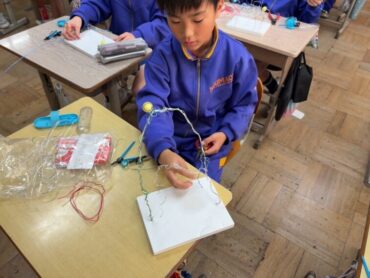 図画工作科では、針金を使って自分が思いついた世界を表現しています。