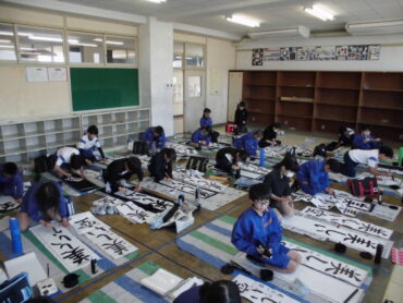 2025.12.3 4年生 4年生 書初練習 4年生は書初の練習を始めています。 今年のお手本は「美しい空」です。 図工室に移動して準備をします。 去年に比べて速く準備をすることができました。 いつもと違う用紙と道具ですが、子どもたちは落ち着いた雰囲気で練習に取り組んでいました。