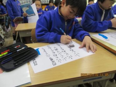 2026.1.16 3年生 3年生 国語科「詩の工夫を楽しもう」 「詩の工夫を楽しもう」での清書を行いました。 子どもたちは「読む」「見る」「見つける」などの工夫をそれぞれが凝らし、 自由詩の完成に向けて取り組んでいました。
