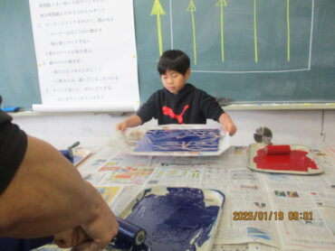 スチレン板に線をかき、インクをのせ、紙を重ねて、バレンですりました。