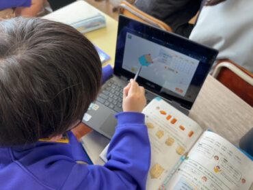 今回は、学習専用端末でシミュレーションを用いながら、三角柱や四角柱などいろんな角柱の側面や頂点、辺の数を調べました。